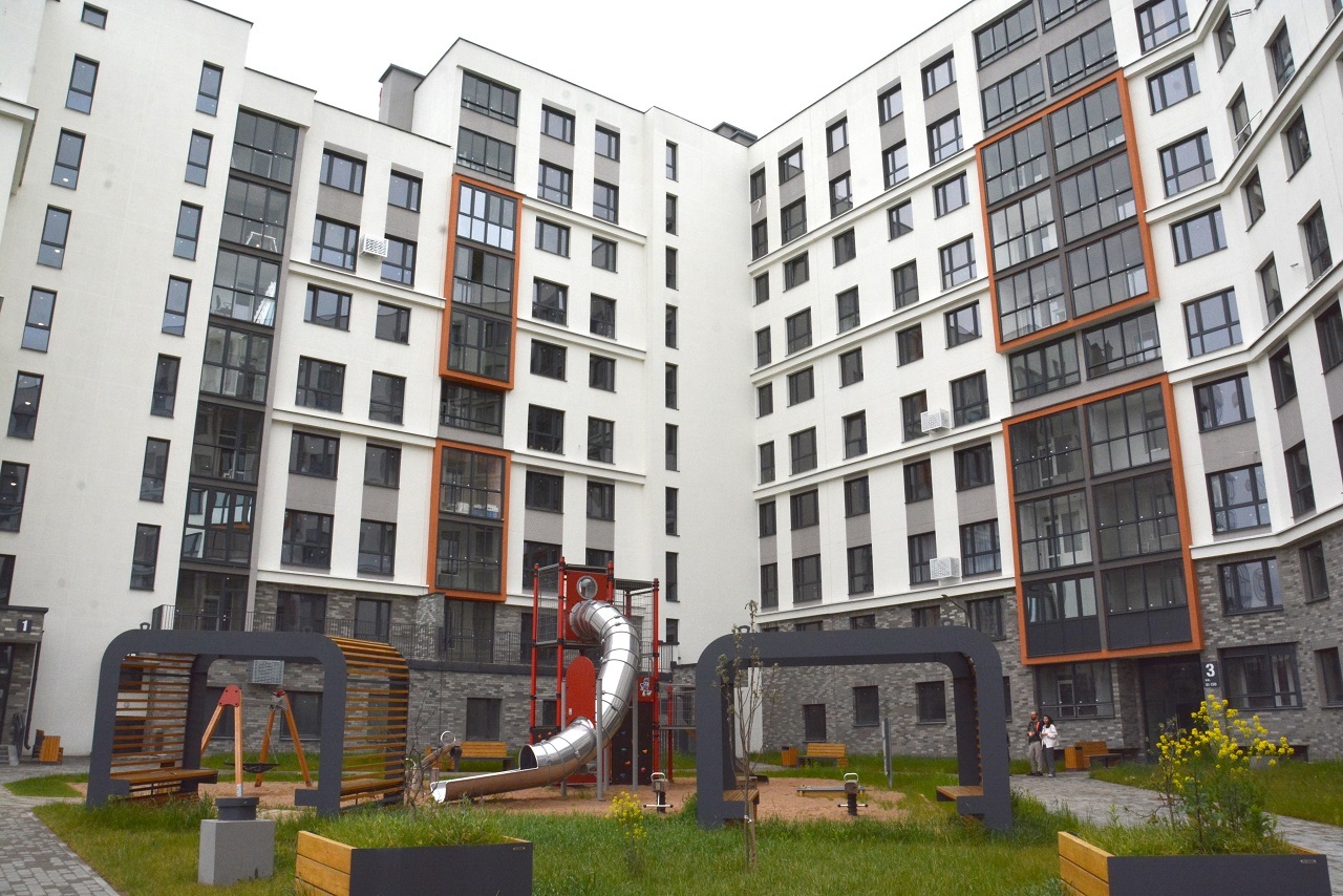 Внутренние дворы освобождены от автомобильного движения и ограждены от внешнего шума, а также оборудованы зонами отдыха, детскими игровыми площадками и велопарковками.