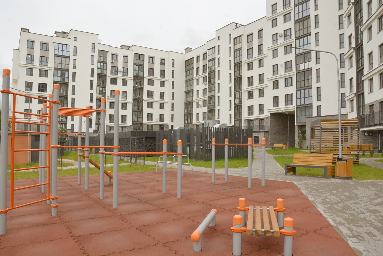 На территории комплекса выполнено благоустройство с зелеными насаждениями, игровой детской площадкой, разработанной с учетом разных возрастных групп детей и площадкой для воркаута.